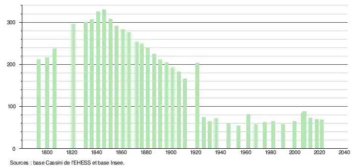 L'évolution du nombre d'habitants est connue à travers les recensements de la population effectués dans la commune depuis 1793. Pour les communes de moins de 10 000 habitants, une enquête de recensement portant sur toute la population est réalisée tous les cinq ans, les populations légales des années intermédiaires étant quant à elles estimées par interpolation ou extrapolation[16]. Pour la commune, le premier recensement exhaustif entrant dans le cadre du nouveau dispositif a été réalisé en 2007[17].