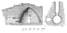 La salle principale de la tombe à tholos, de plan circulaire[2], est recouverte d'un assemblage de blocs de pierres, placés en encorbellement, taillés et polis pour donner l'impression d'une voûte[6] : les blocs sont disposés en rangées horizontales, qui diminuent au fur et à mesure, de même que la dimension des blocs[2]. La salle est creusée dans la terre meuble d'une colline basse, les blocs sont placés par en haut[2].