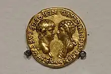 | Claude, après 50 ap. J.-C. | ![]() Claudé lauré à d. | TI CLAVD CAESAR AVG GERM P M TRIB POT P P | Buste de Néron | NERO CLAVD CAESAR DRVSVS GERM PRINC IVVENT Néron en prince de la jeunesse |