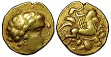 On en a trouvé 20 autres d'origines diverses[5]. On hésite encore sur leur provenance, Cénomans ou peuples limitrophes : Angevins, Vénètes ou Ligériens. Ils représentent en majorité une tête avec des cordons perlés accompagnée d'une sorte d'hippocampe formant cimier, le revers est assez identique au type précédent.