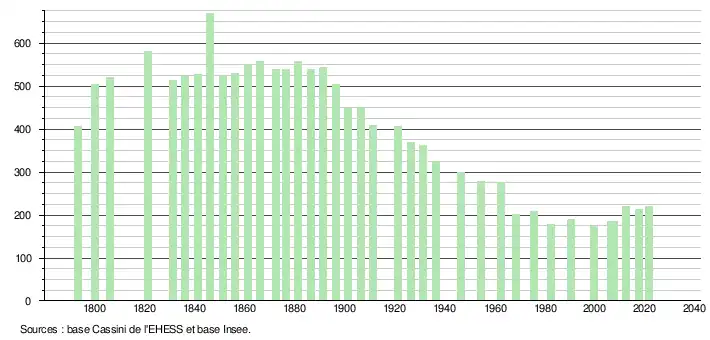 L'évolution du nombre d'habitants est connue à travers les recensements de la population effectués dans la commune depuis 1793. Pour les communes de moins de 10 000 habitants, une enquête de recensement portant sur toute la population est réalisée tous les cinq ans, les populations légales des années intermédiaires étant quant à elles estimées par interpolation ou extrapolation[18]. Pour la commune, le premier recensement exhaustif entrant dans le cadre du nouveau dispositif a été réalisé en 2007[19].