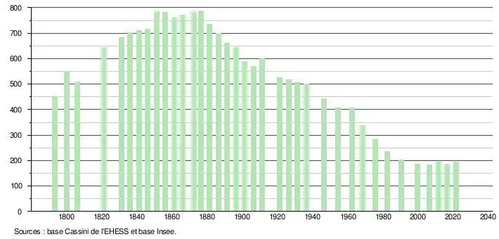 | L'évolution du nombre d'habitants est connue à travers les recensements de la population effectués dans la commune depuis 1793. Pour les communes de moins de 10 000 habitants, une enquête de recensement portant sur toute la population est réalisée tous les cinq ans, les populations légales des années intermédiaires étant quant à elles estimées par interpolation ou extrapolation[30]. Pour la commune, le premier recensement exhaustif entrant dans le cadre du nouveau dispositif a été réalisé en 2006[31]. En 2021, la commune comptait 195 habitants[Note 6], en augmentation de 3,72 % par rapport à 2015 (Tarn : +1,82 %, France hors Mayotte : +1,84 %). |
