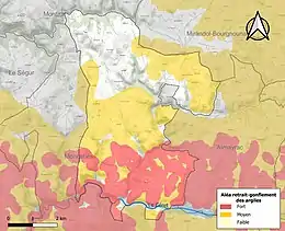 La commune est vulnérable au risque de mouvements de terrains constitué principalement du retrait-gonflement des sols argileux[25]. Cet aléa est susceptible d'engendrer des dommages importants aux bâtiments en cas d’alternance de périodes de sécheresse et de pluie. 68 % de la superficie communale est en aléa moyen ou fort (76,3 % au niveau départemental et 48,5 % au niveau national). Sur les 138 bâtiments dénombrés sur la commune en 2019, 112 sont en aléa moyen ou fort, soit 81 %, à comparer aux 90 % au niveau départemental et 54 % au niveau national. Une cartographie de l'exposition du territoire national au retrait gonflement des sols argileux est disponible sur le site du BRGM[26],[Carte 3].