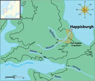 À l'époque où vivaient les hommes de Happisburgh, un pont terrestre existait entre la Grande-Bretagne et la France, avant que se forme la Manche il y a environ 450 000 ans. La Tamise coulait plus au nord qu'elle ne le fait aujourd'hui, avant de converger avec l'ancienne rivière Bytham[13], tandis que les paysages d'une grande partie du Norfolk et du Suffolk d'aujourd'hui étaient composés d'une série de crêtes argileuses et de creux, connus sous le nom de East Anglian Crag Basin[14]. Happisburgh se trouvait à environ 25 km plus à l'intérieur des terres qu'il ne l'est aujourd'hui, et était le lieu d'un ancien estuaire où la Bytham et la Tamise convergeaient pour se déverser ensuite dans ce qui devait être alors une baie maritime[7].
