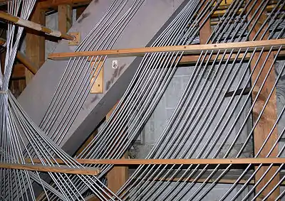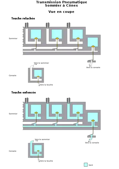 Dans un système à pression, le vent s'engouffre ainsi dans la tubulure, composée de tubes en plomb d'environ 0,6 cm de diamètre intérieur, faisant le lien entre la console et les sommiers. Au niveau du sommier, l'air sous pression va soulever un petit soufflet (ou membrane) qui va lui-même ouvrir la soupape du sommier. Une fois cette soupape ouverte, les tuyaux sont alimentés en vent et peuvent ainsi parler.