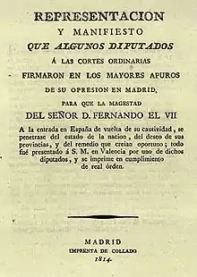 La guerre d'indépendance espagnole et les Cortes de Cadix conduisirent à une profonde révision des positions politiques en Espagne. La Constitution de Cadix de 1812 définit la position initiale du libéralisme espagnol (es), dont dériverait tout au long du XIXe siècle un libéralisme progressiste et démocratique. Ainsi, selon l’opinion dominante dans l’historiographie générale, le traditionalisme en tant qu’option politique apparaît pour la première fois aux Cortès de Cadix de 1812[29],. Le texte qui est généralement présenté comme le premier document politique du traditionalisme est le Manifeste des Perses de 1814 — programme couvrant un large spectre de réformes politiques qui fut présenté à Fernando VII à son retour de l'exil, dont l'héritier politique fut le carlisme[6]. —[31],[32],[33], suivi en 1822 par le Manifiesto del Barón de Eroles (« Manifeste du baron d’Eroles »)[34] et le Manifiesto de los Realistas Puros (« Manifeste des royalistes purs ») de 1826[35]. Cependant, concernant le début du XIXe siècle, la plupart des universitaires préfèrent parler de « royalistes »[36],[37], d’« ultras », d’« apostoliques » ou de « serviles »[38], et n’utilisent le qualificatif de traditionaliste qu’à partir des années 1830[39],[40]. Politiquement, les membres de ce groupe avaient tendance à ne pas mettre en avant leur anti-absolutisme lorsqu'ils soutenaient Ferdinand VII dans son zèle anti-révolutionnaire ; ce n'est que dans les années 1820 que le roi commença d’être considéré comme vacillant et peu fiable, et que leur affinité s’est graduellement déplacé vers son frère fermement réactionnaire, Don Carlos.