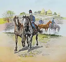Le harnachement principal est composé d'une demi-chabraque en peau de mouton avec des festons du même gris que l'uniforme et d'une housse de selle avec un galon blanc liserant une housse de la même couleur que l'habit-veste[2].