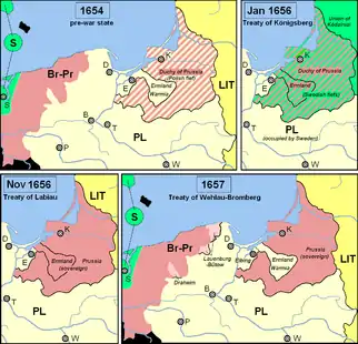 En 1656, au début de la grande guerre du Nord, les Hohenzollern-Brandebourg prirent ainsi la souveraineté sur le duché de Prusse et la Varmie comme fiefs suédois par le traité de Königsberg, avant que le roi de Suède n'abolisse le statut de fief vassal de ces provinces[5]. Après avoir combattu aux côtés de l’armée suédoise en 1656, et s'être particulièrement illustré à la bataille de Varsovie, Frédéric-Guillaume Ier envisagea un retournement d'alliance : il fit connaître au roi de Pologne Jean-Casimir qu'il changerait de camp si la couronne de Pologne lui accordait les mêmes titres que le roi de Suède Charles-Gustave sur les terres de Poméranie et de Prusse. Ces conditions furent négociées à Wehlau (auj. Znamensk) et Bromberg[6].