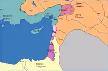 - Son territoire est délimité au nord, avec obligation de restituer la côte de Cilicie et les environs de Lattaquié, mais avec la possibilité de l'agrandir par des conquêtes sur les territoires des princes musulmans de Syrie.