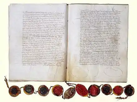 Le document pacificateur était si important aux sujets qu'il a été mis à l'abri dans la ville d'Empire, à l'intérieur d'une caissette fermée par quatre serrures. Il est conservé maintenant aux archives d'État d'Augsbourg.