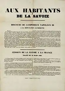 En mars 1860, cependant, alors que le Piémont était en train d'annexer l'Émilie et la Toscane, Napoléon III accepta de sanctionner les acquisitions italiennes du Piémont en échange de Nice et de la Savoie. La France a annexé les provinces par les dispositions du traité de Turin, signé le 24 mars 1860. Il s'est ensuivi un plébiscite profondément vicié à Nice les 15 et 16 avril et en Savoie les 22 et 23 avril, au cours duquel "apparemment et sans aucun doute" la grande majorité des habitants des deux territoires ont voté pour approuver le traité et rejoindre la France. La France prend formellement possession de Nice et de la Savoie le 12 juin 1860. Le vote est cependant profondément influencé par l'accord antérieur entre les autorités savoyardes-piémontaises et la France, faisant même des autorités savoyardes une part active dans la promotion d'un résultat favorable à la France : de nombreux Niçards sont exclus, pour diverses raisons, des listes électorales, tandis que sont inscrits de nombreux Français spécialement transférés, et les opérations se déroulent sous le contrôle des autorités françaises et avec la présence dans la ville de troupes françaises[12] ne pas faire douter : par exemple, 119 marins niçois, stationnés sur les navires savoyards dans les différents ports, qui pouvaient voter librement, se sont exprimés ainsi : 114 pour rester en Italie et 5 pour passer en France[13]. Cet événement a provoqué l'exode Niçard, ou l'émigration d'un quart des Italiens niçards vers l'Italie[14].