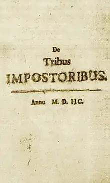 Ce thème des trois imposteurs fut remis en vogue dans l’Europe du XVIIIe siècle, où plusieurs livres nommés ou surnommés Traité des trois imposteurs (en latin : De Tribus Impostoribus) circulèrent clandestinement. L'un d'eux, rédigé en français, est plus connu sous le nom de La Vie et l’esprit de M Benoit Spinoza ou L’Esprit de Spinoza.