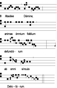 Il existe une autre ancienneté. Au regard de l'ambitus, il est rare qu'un trait dépasse six degrés, plus précisément, l'élan est normalement limité entre les fa et do (voir aussi la notation de l'Absolve, Domine au-dessus)[wp 3] :