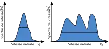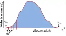 Habituellement, de nombreuses cibles sont présentes dans le volume de l'échantillon radar. Chacune des cibles individuelles produit un décalage de fréquence en fonction de sa vitesse radiale ce qui fait que et ne varie pas d'une façon aussi régulière qu'il serait attendu pour une cible unique. En faisant une transformée de Fourier discrète du signal discret , il est possible d'obtenir la variation de la puissance renvoyée dans un intervalle de décalage fréquentiel (spectre Doppler) et donc la variation de vitesse entre les différentes cibles à la distance d'où reviennent les impulsions[2],[3]. Ceci est illustré sur la figure à droite, où un schéma de spectre Doppler est affiché. La fréquence est déjà convertie en vitesse radiale dans l'axe des abscisses. À partir du spectre Doppler, la réflectivité () peut être calculée en utilisant l'expression: