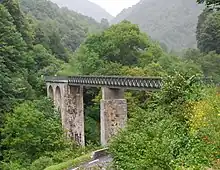 Après Nestalas, la ligne s'élève par un grand circuit à travers des prairies jusqu'au tunnel du Cap d'Estang. Ensuite, elle passe près de la mine de Peñarroya, qui possédait une halte pour ses ouvriers (mais le train n'assurait pas le transport du minerai). Elle suit un temps l'ancien tracé de la route, puis franchit le gave de Cauterets à la passerelle de Meyabat. Celle-ci est composée de quatre arches en pierre et de deux travées métalliques de 22,50 m qui reposent sur une pile centrale en maçonnerie de 16 m de haut, soit une longueur totale de 95 m.
