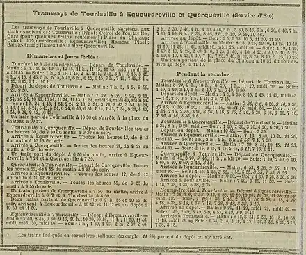 L'horaire d'été 1925 du tramway indique des fréquences de 8 tramways à l'heure dans le tronçon urbain et de 4 tramways à l'heure pour la partie suburbaine de Tourlaville et à Équeurdreville. Querqueville était servi toutes les trente minutes et Urville avait huit services par jour (porté à vingt-deux départs le dimanche)[14].