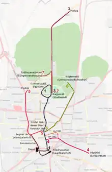 ![]() Rame historique de Debrecen, en 2005 | ![]() Plan du réseau en 1970 |