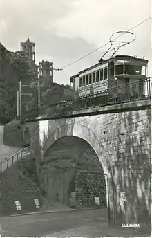 Le tramway au terminus de la ville haute, place de l'Hôtel-de-Ville, vers 1905. | ||||||||||||||||||||||||||||||||||||||||||||||||||||||||||||||||||||||||||||||||||||||||||||||||||||||||||||||||||||||||||||||||||||||||||||||||||||||||||