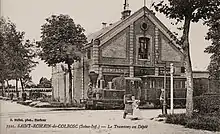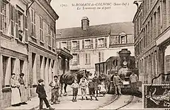 Le dossier fut transmis au Conseil général qui l'accueillit favorablement dans sa séance du 29 août 1894, autorisant la mise à l'enquête du projet et acceptant le principe d'une participation financière du département pour l'établissement de la ligne[2]. Malgré‚ l'opposition de certaines communes, qui auraient souhaité, lors de l'enquête d'utilité publique, la traction hippomobile pour favoriser l'élevage des chevaux dans le canton ou qui craignaient l'encombrement de la voie publique par le tramway, le sort de la petite voie ferrée évolua favorablement. Une société, au capital de 100 000 francs, la Compagnie du Tramway de Saint-Romain-de-Colbosc, était fondée et tenait sa première assemblée générale le 17 août 1895, choisissant comme président M. Benoist, un notable local ; ce même mois, les voitures étaient commandées auprès des établissements Serpollet[5]. En février 1896, les travaux, commencés l'automne précédent, étaient déjà bien avancés, la petite ville était transformée en chantier, une scierie à vapeur avait été installée pour débiter les traverses, une partie des voies était posée, certains bâtiments achevés, comme le dépôt ou la gare de Saint-Romain-Ville. Les premiers essais des automotrices Serpollet débutèrent les premiers jours de mai[6]. Le tramway put commencer son exploitation le 18 mai 1896.