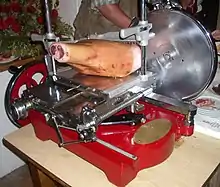 La première trancheuse à jambon a été inventée par Wilhelm van Berkel à Rotterdam en 1898[1],[2],[3]. Les premiers modèles utilisaient un système à manivelle ; les plus récentes ont généralement un moteur électrique[4].