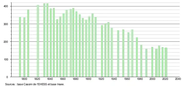 L'évolution du nombre d'habitants est connue à travers les recensements de la population effectués dans la commune depuis 1793. Pour les communes de moins de 10 000 habitants, une enquête de recensement portant sur toute la population est réalisée tous les cinq ans, les populations légales des années intermédiaires étant quant à elles estimées par interpolation ou extrapolation[23]. Pour la commune, le premier recensement exhaustif entrant dans le cadre du nouveau dispositif a été réalisé en 2005[24].