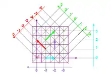 Ces 2 valeurs (p,q) sont précisément celles qui caractérisent la transformée Mojette. Elles définissent l'angle de projection. La figure 3 montre des flèches de couleur correspondant chacune (par le code de couleur) à la projection indexée par (p,q). Pour l'angle 90°, la projection est représentée en dessous de la grille pour plus de commodités mais la direction est bien montante. Le tableau 1 fait la correspondance entre les angles en degrés et les valeurs de p et q.