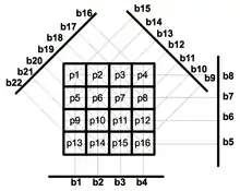 On part de la fonction f(k,l) représentée par les 16 pixels p1 à p16. Ces valeurs possibles de la fonction au point (k,l) différent selon les applications. Cela peut être une valeur binaire 0 ou 1 comme souvent utilisés pour différencier le fond et la forme. Cela peut être une valeur ternaire comme dans le jeu Mojette. Cela peut être également un ensemble fini de valeurs entières entre 0 et (n-1), ou souvent on prend un ensemble de cardinal égal à une puissance de 2 ou bien un nombre premier. Mais cela peut encore être les entiers ou les réels avec un nombre infini de possibilités, même si cette dernière idée ne sera quasiment jamais exploitée.