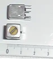 Il comporte donc 4 broches. Les enroulements sont constitués de fils isolés très fins, car le courant qui les traverse est faible (quelques mA). Ils se trouvent à l'intérieur d'un blindage métallique léger, qui est normalement relié à la masse du circuit imprimé sur lequel il est monté. L'accord du transformateur FI se fait par un noyau plongeur (en ferrite, afin de réduire les pertes). En vissant ou en dévissant le noyau avec un petit tournevis (de préférence en plastique, pour éviter les effets parasites), on ajuste la fréquence d'accord des enroulements. Un condensateur est branché en parallèle sur l'enroulement primaire, afin de constituer un circuit LC accordé sur la fréquence intermédiaire.