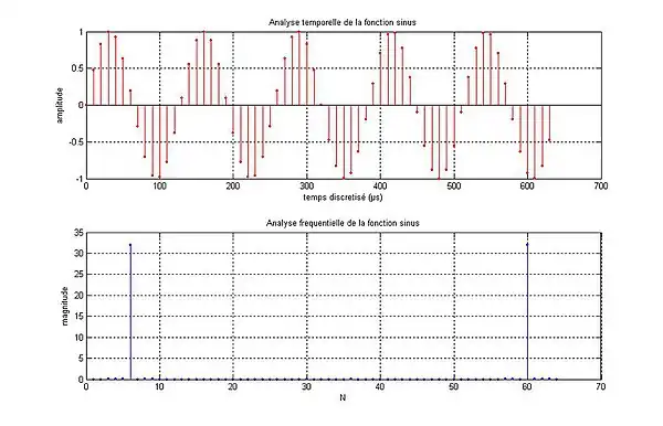 En mathématiques, la transformation de Fourier discrète (TFD) sert à traiter un signal numérique[1]. Elle constitue un équivalent discret (c'est-à-dire pour un signal défini à partir d'un nombre fini d'échantillons) de la transformation de Fourier (continue) utilisée pour traiter un signal analogique. Plus précisément, la TFD est la représentation spectrale discrète dans le domaine des fréquences d'un signal échantillonné.