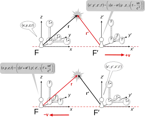 Soient deux référentiels et en translation rectiligne l'un par rapport à l'autre sur des axes parallèles, avec une vitesse relative v selon l'axe Ox. Soient les coordonnées spatio-temporelles d'un événement dans le référentiel , et ses coordonnées dans le référentiel . (Pour simplifier les notations, on ne tiendra pas compte dans ce paragraphe des deux autres composantes spatiales y et z).