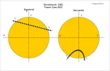 Sur la figure ci-contre on a représenté le passage de , pour un observateur situé à Christchurch en Nouvelle-Zélande, dans le système équatorial sur la figure de gauche, et dans le système horizontal à droite. Le premier système est fixe en orientation sur le plan du ciel, même si le centre se déplace avec le Soleil. Le second système est lui en rotation par rapport au système équatorial, et la trajectoire apparente (ce que l'on verrait avec un théodolite par exemple) est plus compliquée et difficile à prévoir sans des calculs détaillés. Nous sommes ici dans l'hémisphère sud et lors du passage, il faut regarder vers le nord. La direction de la verticale est très éloignée de celle de l'étoile polaire. Le pôle nord céleste est même sous les pieds de l'observateur: c'est pour cela que la trajectoire de Vénus apparaît en bas du Soleil. Vénus se déplace grossièrement d'est en ouest sur le Soleil, soit dans l'hémisphère sud à peu près de la droite vers la gauche.