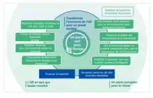 - axe 2 : S'engager dans l'économie circulaire et sobre en carbone, en ayant pour priorités : « réorienter les modèles de production, d’échange et de consommation ; rendre notre économie moins dépendante des ressources non renouvelables ; mettre en place une nouvelle politique industrielle et agricole plus économe en ressources et s'appuyant sur l'innovation ; mobiliser les territoires et favoriser les initiatives locales »[8] ;