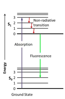 L'électron du niveau d'énergie , excité par un rayonnement électromagnétique passe au niveau d'énergie supérieur . Dans le cas le plus simple d'un atome d'hydrogène (un électron et un proton), l'électron est piégé dans le champ électrique créé par le proton. La mécanique quantique, à l'inverse de la mécanique classique, prévoit que l'électron ne peut alors exister que dans certains états quantiques d'énergie bien déterminés, on parle de quantification d'énergie. Que ce soit sous l'effet de la lumière, des collisions, d'une décharge électrique dans un gaz, etc., on ne peut donc assister qu'à des échanges d'énergie discrets entre l'atome et son environnement.