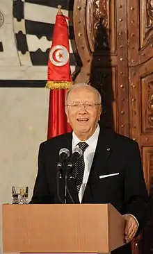 En octobre 2014, Nidaa Tounes remporte les législatives[122]. Dans la foulée, Béji Caïd Essebsi, en tête du premier tour de l'élection présidentielle[123], remporte le le second tour face au président sortant Moncef Marzouki[124].