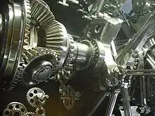 - Engrenages : le pignon du vilebrequin est relié à un ensemble de pignons permettant d'une part d'atteindre les organes récepteurs du mouvement, et d'autre part de définir le sens et la vitesse de rotation en fonction du facteur de réduction obtenu par l'enchaînement de ces pignons ;