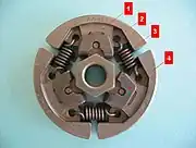 Une autre variante, l'embrayage centrifuge, a également été utilisée sur certaines automobiles, comme la Citroën 2CV, et est encore utilisée sur certains cyclomoteurs et scooters, comme le Vélosolex[alpha 1]ou certaines Mobylette [12], ainsi que sur différentes machines (groupes électrogènes, pompes, compresseurs, etc.[13]). C'est un embrayage automatique à friction dans lequel la rotation du vilebrequin, en faisant tourner l'embrayage, écarte des masselottes qui vont embrayer le mécanisme. Lorsque le régime moteur baisse en dessous d'un certain seuil, le mécanisme peut débrayer spontanément : cette caractéristique, sans conséquence pour la plupart des machines, peut être un inconvénient dans le cas des véhicules car elle peut perturber la conduite, notamment par perte du frein moteur.