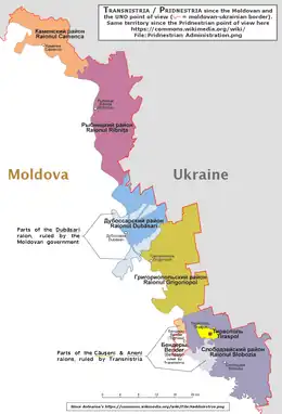 - à la situation de facto (mais que la Transnistrie considère comme étant la seule de jure[10]), que ni le Kremlin ni la Moldavie, ni l’Organisation des Nations unies ne reconnaissent, et qui maintient sous contrôle de la RMD la ville de Bender (Tighina) et les territoires adjacents de la rive droite du Dniestr, mais ne comprend pas l’ensemble du raion de Dubăsari puisque, dans ce raïon, les communes de Cocieri, Molovata Nouă, Corjova, Coșnița, Pîrîta et Doroțca ont choisi de se placer sous l’autorité internationalement reconnue du gouvernement moldave.