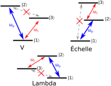 Seules certaines configurations[3] des trois états permettent la TIE. Deux des trois transitions entre les états doivent être autorisées pour des interactions dipolaires électriques ; la troisième transition doit être interdite : un des trois états est connecté aux deux autres par les deux champs optiques. Les trois types de configurations possibles sont différenciées par les écarts d'énergie entre ce dernier état et les deux autres. Ces configurations sont appelées Échelle, V, et Lambda. Tout système matériel réel peut contenir plusieurs triplets d'états qui peuvent théoriquement permettre la TIE, mais il existe plusieurs limitations pratiques limitant les niveaux qui peuvent être utilisés.
