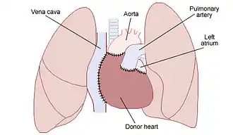 La quasi-intégralité du cœur du receveur est ôtée après mise en place d'une circulation de suppléance (circulation extra-corporelle) : seul le toit de l'oreillette gauche est conservé, avec ses quatre veines pulmonaires. Le cœur du donneur est ensuite mis en place et suturé aux autres gros vaisseaux (aorte, artère pulmonaire, veines caves supérieure et inférieure), ainsi qu'au toit de l'oreillette gauche.