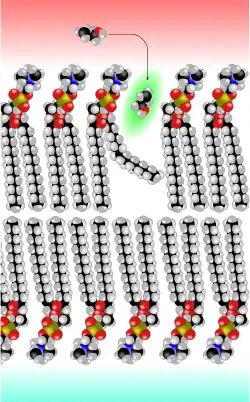 Le biophysicien de Göttingen Hermann Träuble a mis au point en 1971 une théorie sur le transport des petites molécules à travers la membrane cellulaire. Selon cette théorie, ce sont des petits espaces entre les chaînes lipidiques de la double couche lipidique qui sont responsables du transport par diffusion. Ces trous proviennent de passages de la conformation trans à gauche (kinks trans-gauche-trans) dans les chaînes lipidiques des phospholipides de la membrane. Ces changements de conformation dièdres peuvent se produire avec une très faible énergie. En outre, ils sont mobiles et peuvent se déplacer avec la molécule occupant l'espace, à travers la membrane[6],[7],[8],[9]. La théorie de Träuble a été confirmée en 1974 par Anna et Joachim Seelig au moyen de la RMN[10],[11].