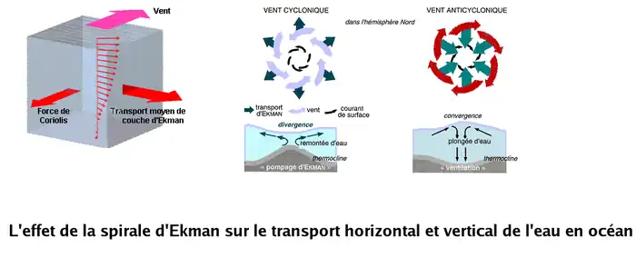 Le vent qui souffle sur l'océan fait bouger la couche de surface, mais la force de Coriolis dévie ce mouvement vers la droite dans l'hémisphère nord et vers la gauche dans l'hémisphère sud. Cette déviation se propage vers le bas par viscosité et on obtient un transport moyen de matière hors de l'axe des vents de surface. C'est ce que l'on voit dans la partie de gauche de l'image. Selon la trajectoire des vents, on pourra avoir divergence ou convergence de matière, ce qui crée les deux situations de pompage et de ventilation montrées dans l'image.