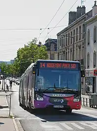 Le Bombardier TVR ayant quitté la station Division de Fer en direction de Essey Mouzimpré. | |
