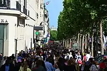 La marche est, de loin, le principal mode de déplacement : elle assure 40 % de l'ensemble des trajets quotidiens, qu'ils soient internes à Paris ou entre Paris et la banlieue. En surface, elle représente 75 % des déplacements, alors que les trottoirs ne couvrent que 40 % de la voirie. Après avoir baissé des années 1970 aux années 1990, elle est désormais stabilisée[2]. Elle a notamment été victime, pendant les Trente Glorieuses, d'une politique consistant, sur les plus grandes avenues, à considérablement réduire la largeur des trottoirs au profit de la chaussée, passée par exemple de 14 à 22 mètres sur le boulevard Malesherbes[3].