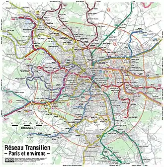 Les cinq lignes du RER sont des lignes au gabarit ferroviaire desservant à la fois la banlieue et le centre de Paris. Elles ont été progressivement réalisées à partir des années 1970 en connectant des lignes de banlieue entre elles. La ligne A du RER détient le record mondial du nombre de voyageurs transportés, en étant, par ailleurs, la plus fréquentée d'Europe avec 1,4 million de voyageurs quotidiens.