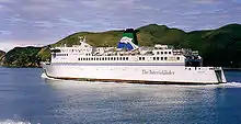 Ferry de l'Interisland Line (en) dans les Marlborough Sounds après la traversée du Détroit de Cook.