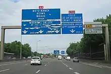 | Autoroute A104 | Autoroutes A1 et A3 à Gonesse | Mitry-Mory, Villeparisis, Lagny-sur-Marne, Marne-la-Vallée | Autoroute A4 à Collégien | Partie de la Francilienne. Autoroute gratuite à 2x2 voies ou 2x3 voies selon les sections. |