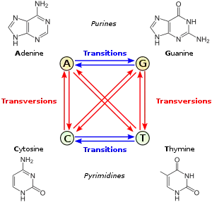 Bien qu'il existe deux transversions possibles mais une seule transition possible par base, les mutations de transition sont plus probables que les transversions car la substitution d'une structure à un seul anneau par une autre structure à un seul anneau est plus probable que la substitution d'un double anneau à un seul anneau. De plus, les transitions sont moins susceptibles d'entraîner des substitutions d'acides aminés (en raison de la paire de bases oscillantes) et sont donc plus susceptibles de persister en tant que «substitutions silencieuses» dans les populations en tant que polymorphismes mononucléotidiques (SNP)[2]. Une transversion a généralement un effet plus prononcé qu'une transition parce que la troisième position du codon nucléotidique de l'ADN, qui est en grande partie responsable de la dégénérescence du code, est plus tolérante à la transition qu'une transversion : c'est-à-dire qu'une transition est plus susceptibles de coder pour le même acide aminé.