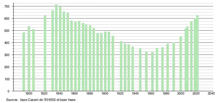 L'évolution du nombre d'habitants est connue à travers les recensements de la population effectués dans la commune depuis 1793. Pour les communes de moins de 10 000 habitants, une enquête de recensement portant sur toute la population est réalisée tous les cinq ans, les populations légales des années intermédiaires étant quant à elles estimées par interpolation ou extrapolation[17]. Pour la commune, le premier recensement exhaustif entrant dans le cadre du nouveau dispositif a été réalisé en 2008[18].