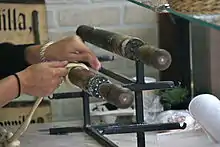 - La première consiste à faire un serpentin de pâte de la taille d'un doigt, d'environ 60 centimètres de long, et à enrouler le serpentin autour du rondin de bois, ce qui crée une forme de ressort de 10 à 15 centimètres de long.