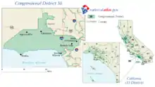À partir du redécoupage de 2020, le 30e district congressionnel de Californie est situé dans le sud de l'État. Deux sections du district se trouvent dans le Comté de Los Angeles, et les deux autres sections couvrent des parties du nord de Los Angeles.